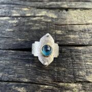 A wavy silver heart with scrolled design and set with a single rose coloured pearl. Secured on a plain finished ring.