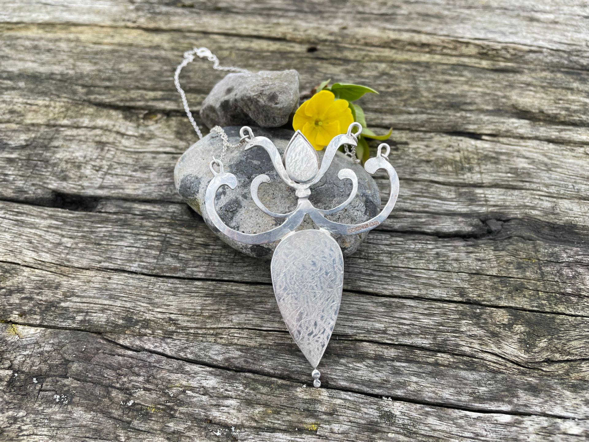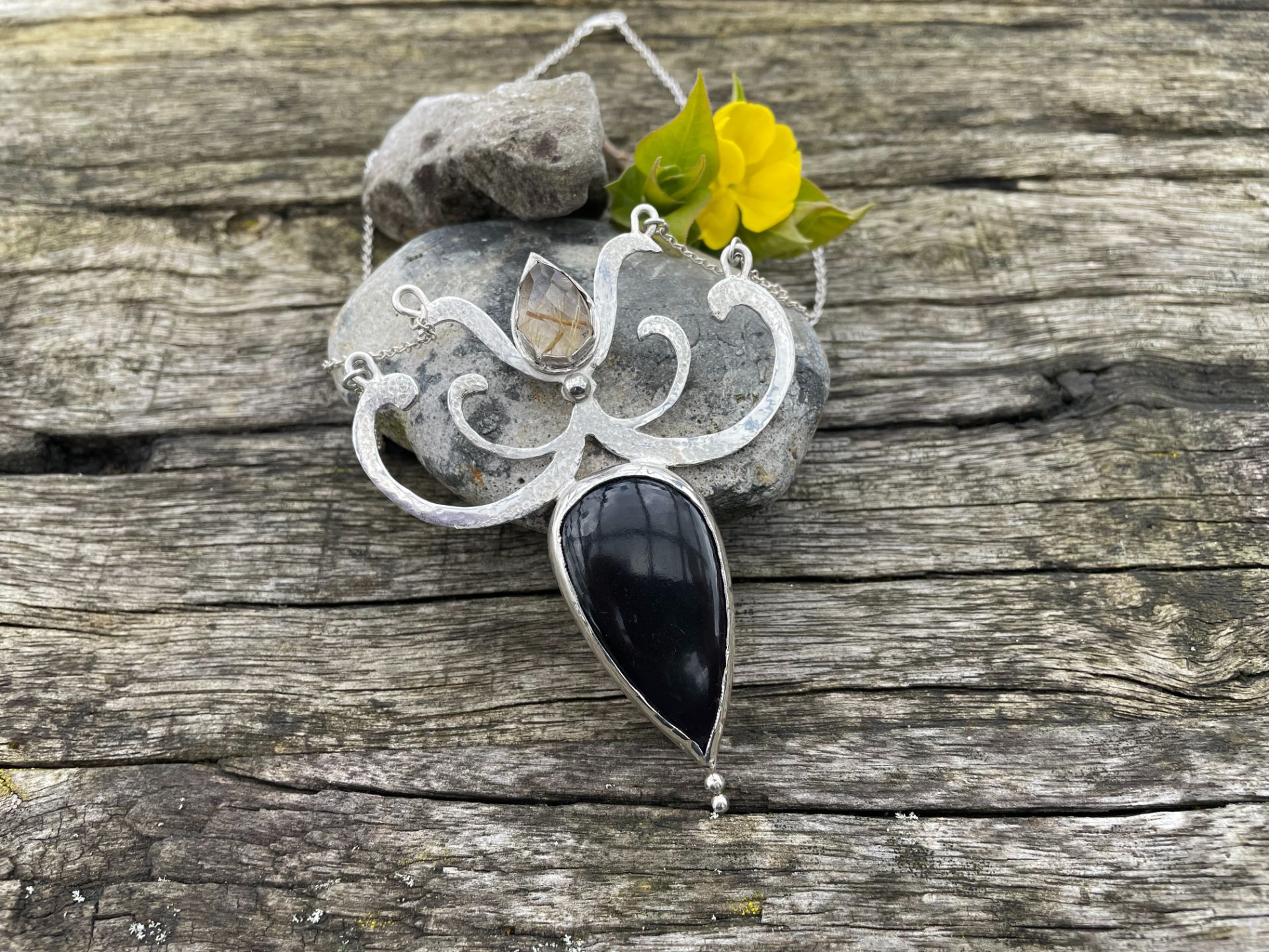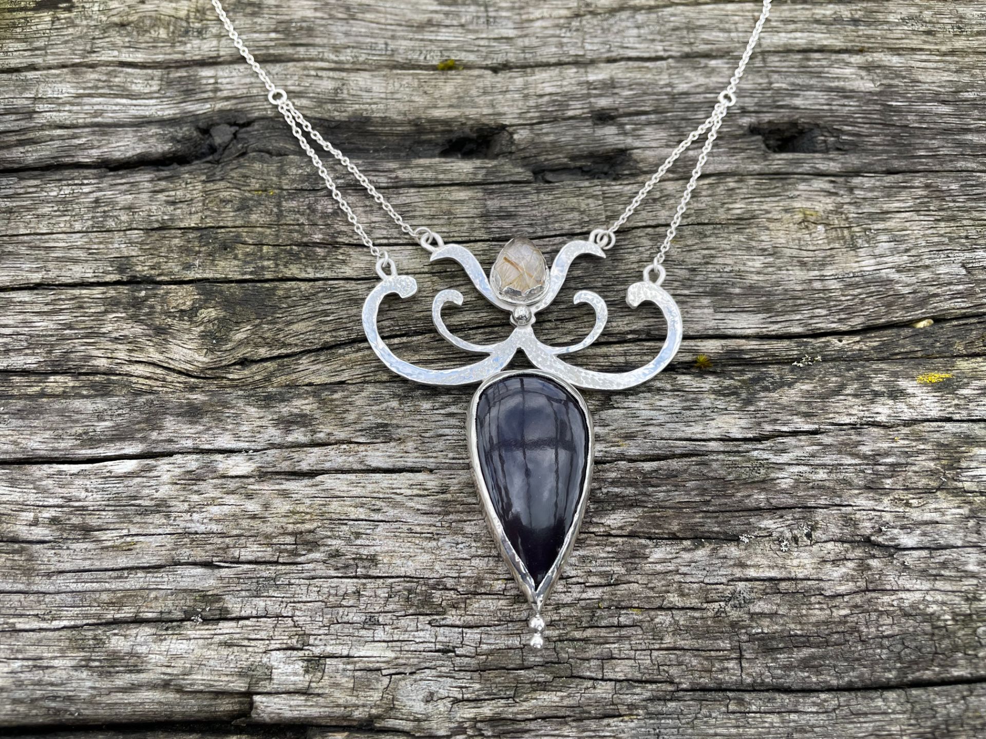 A beautiful dark pear shaped rainbow obsidian with silky greens and purples that show in soft light. Above this is a faceted rutilated quartz with shards of gold inside. Set in a unique curly silver setting that has been textured with soft hammering to complement the stones. The reverse has been engraved with curled marks to match the main shape. A truly unique statement piece.