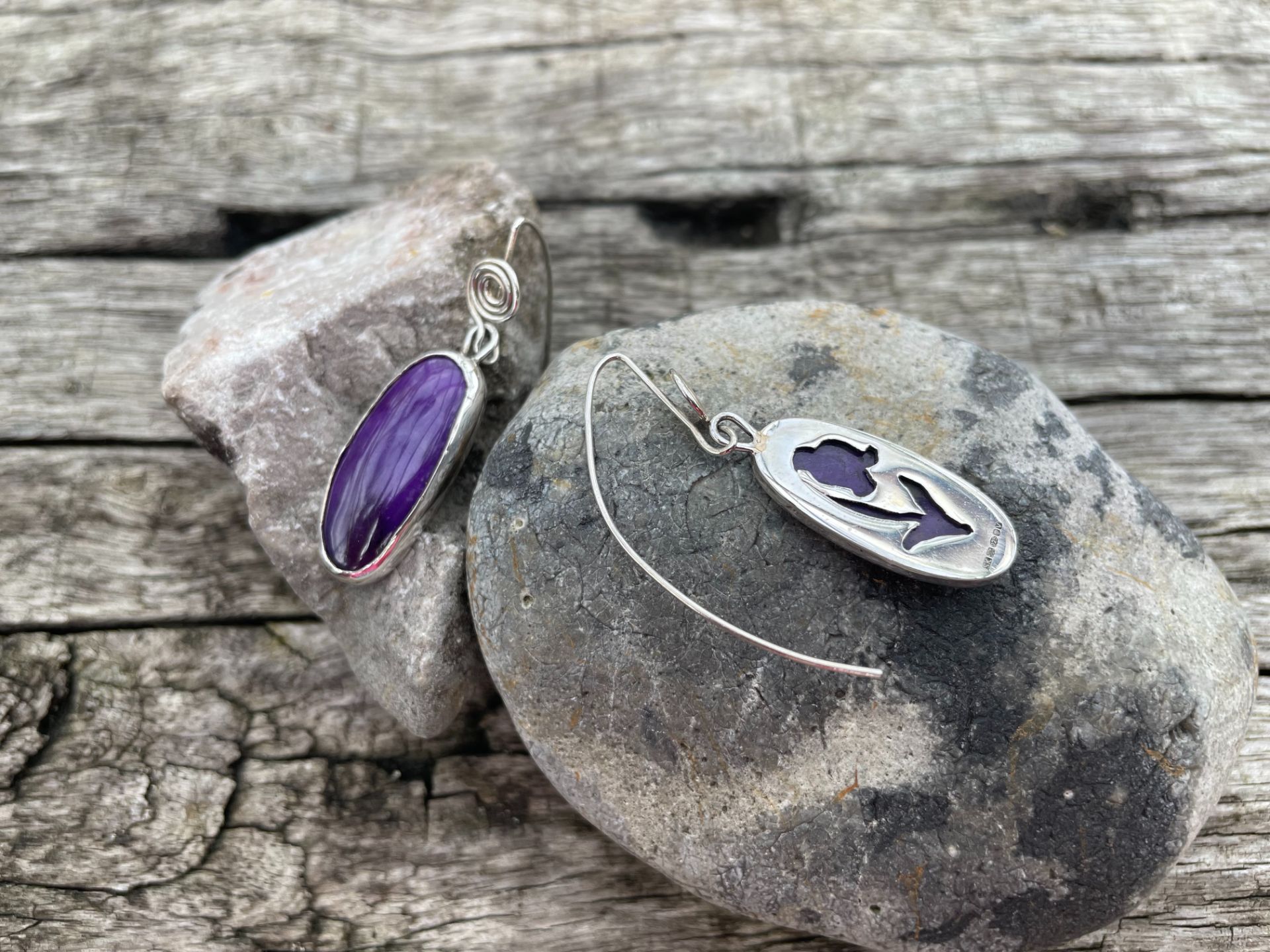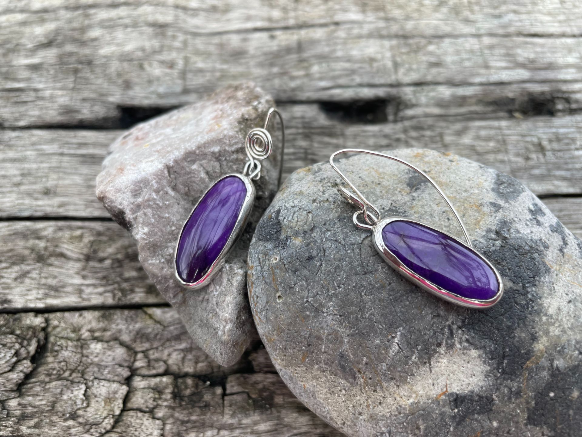 Two almost matched, sugilite stones, set in sterling silver bezelled settings with a snowdrop cut out on the back.  Please note that due to the irregularity of the stones these earrings are similar but not exact matches of each other.   Suspended on a spiral ear wire.